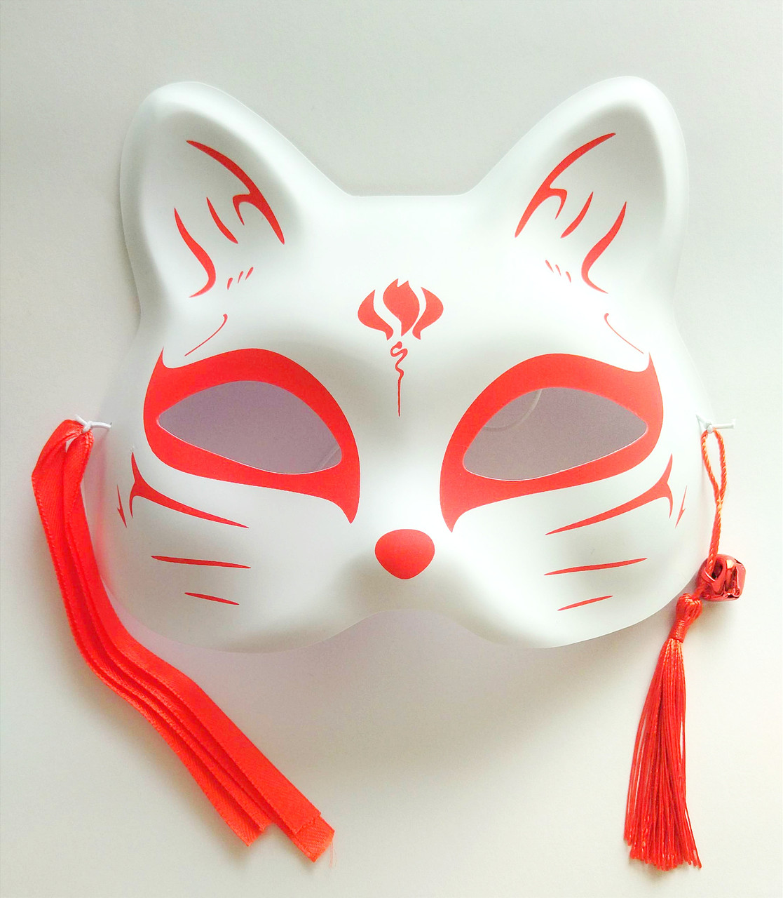 Біла маска кішки з пластику для квадробіки на гумці, декорована стрічками та дзвіночками, а також візерунками червоного кольору